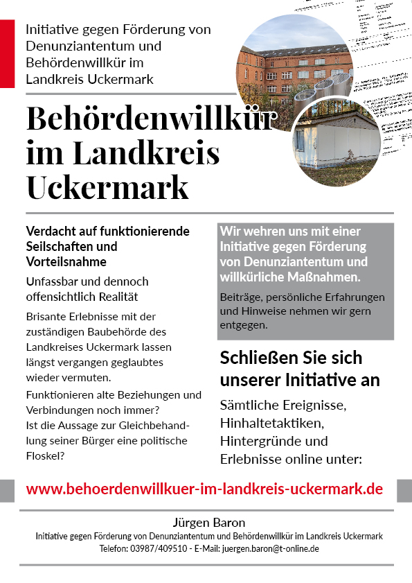 Behördenwillkür im Landkreis Uckermark . Jürgen Baron . Schinkelstraße 20 . 17268 Templin . Telefon: (03987) 409510 . Mail: juergen.baron@t-online.de